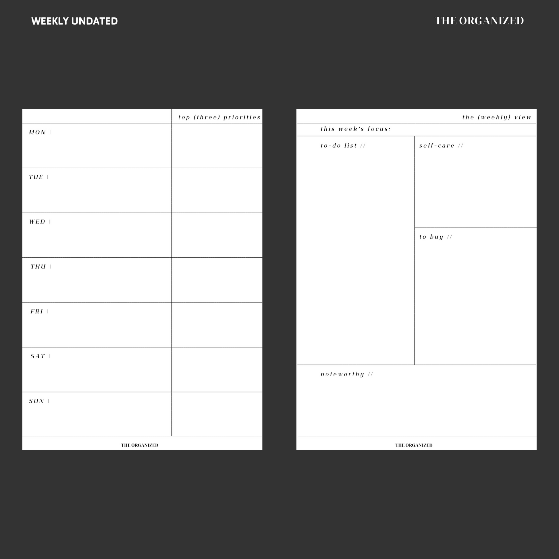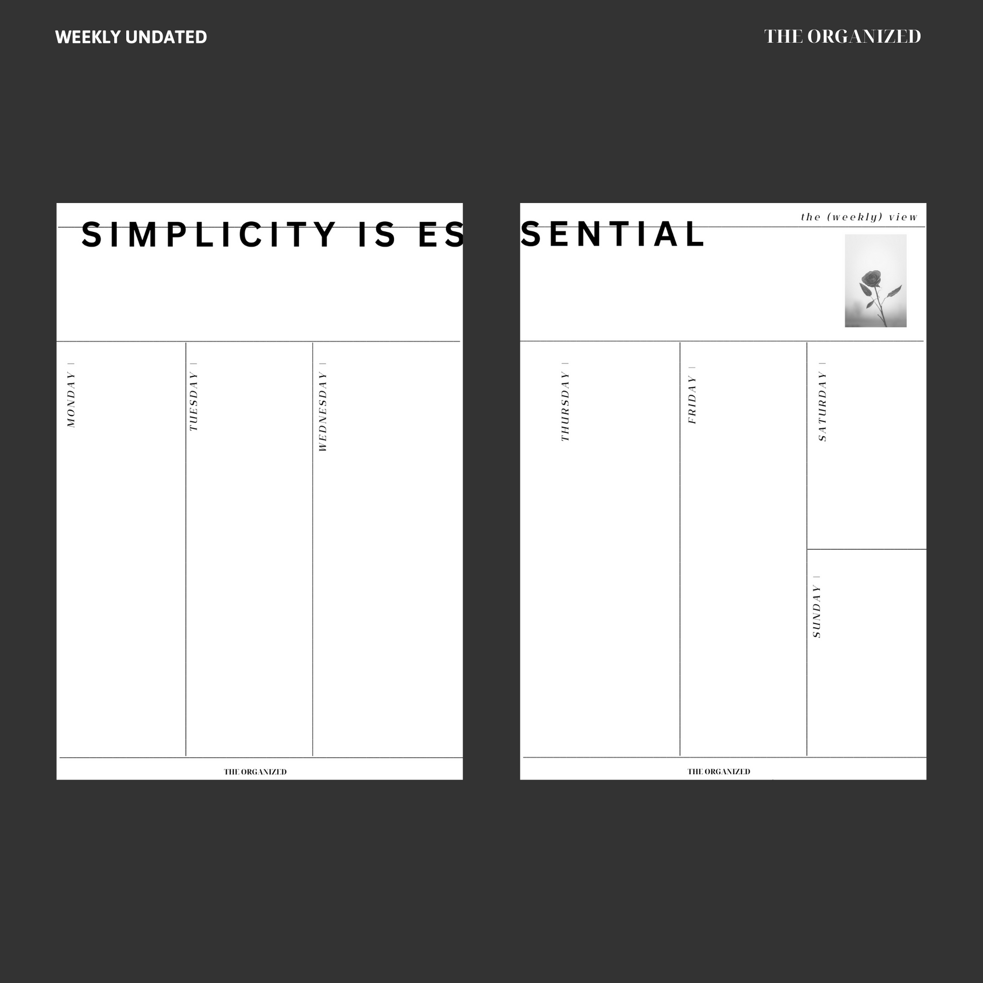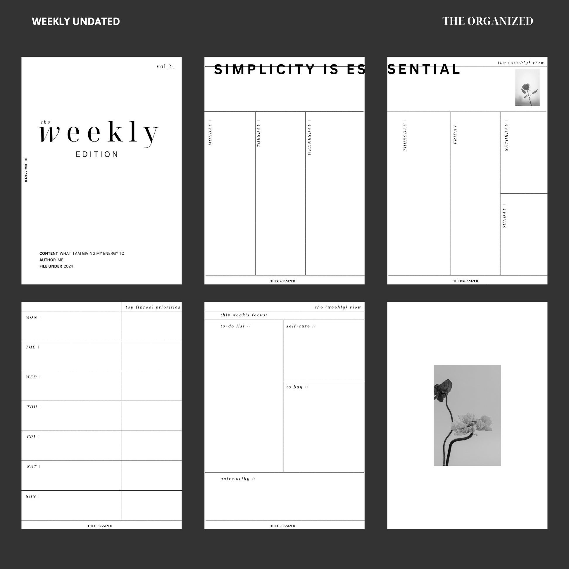This design includes two weekly layouts: one minimalist view with space for your weekly events and schedule, the other also includes a page for tracking all the important things (to-dos, self-care, lists and notes). Choose which version works best for your lifestyle or use them both!